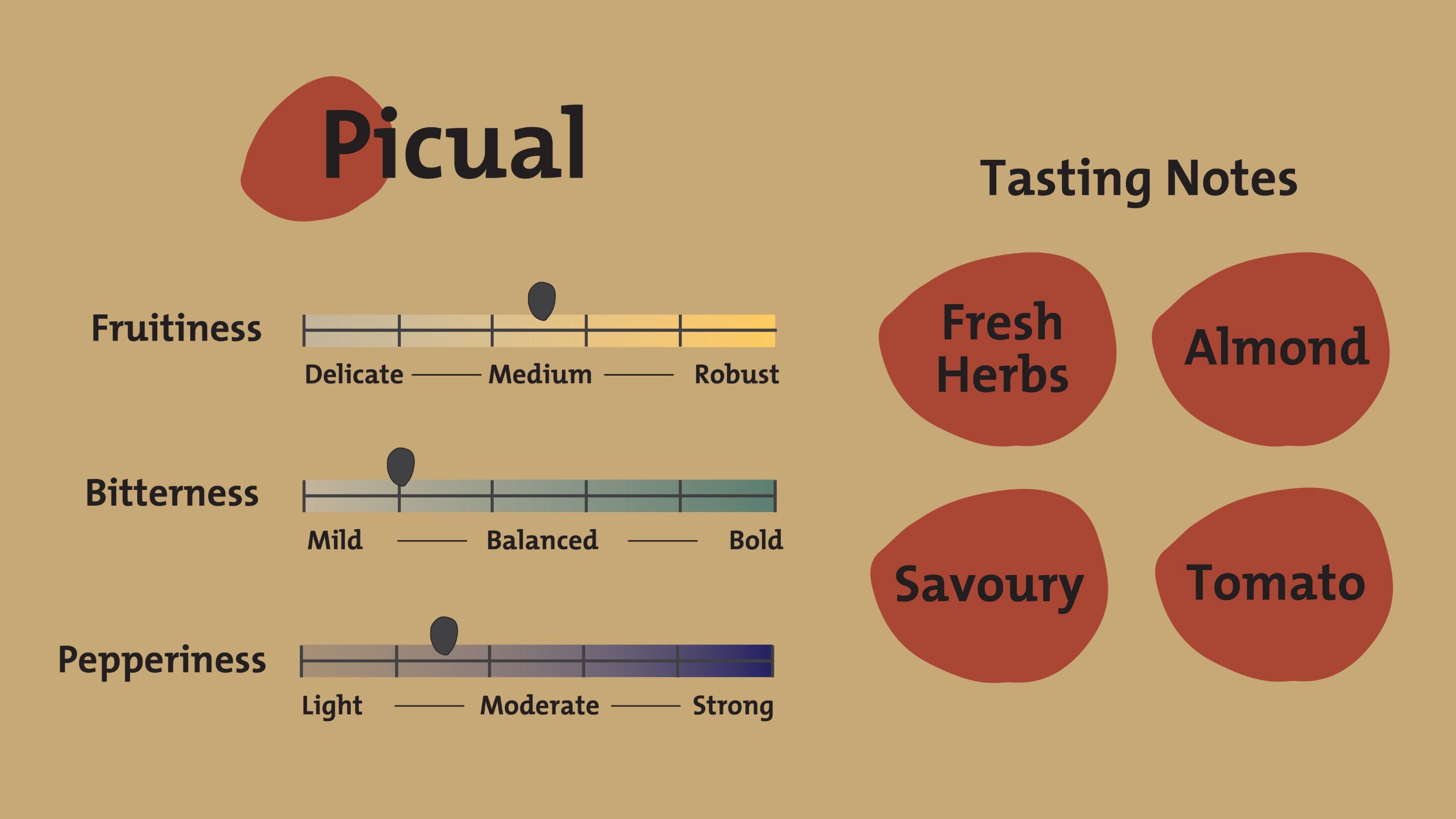 素晴らしいペッパー風味のフィニッシュを備えたフルーティーなピクアルは、どんなお料理にも万能なミディアムスタイルのオリーブオイルです。